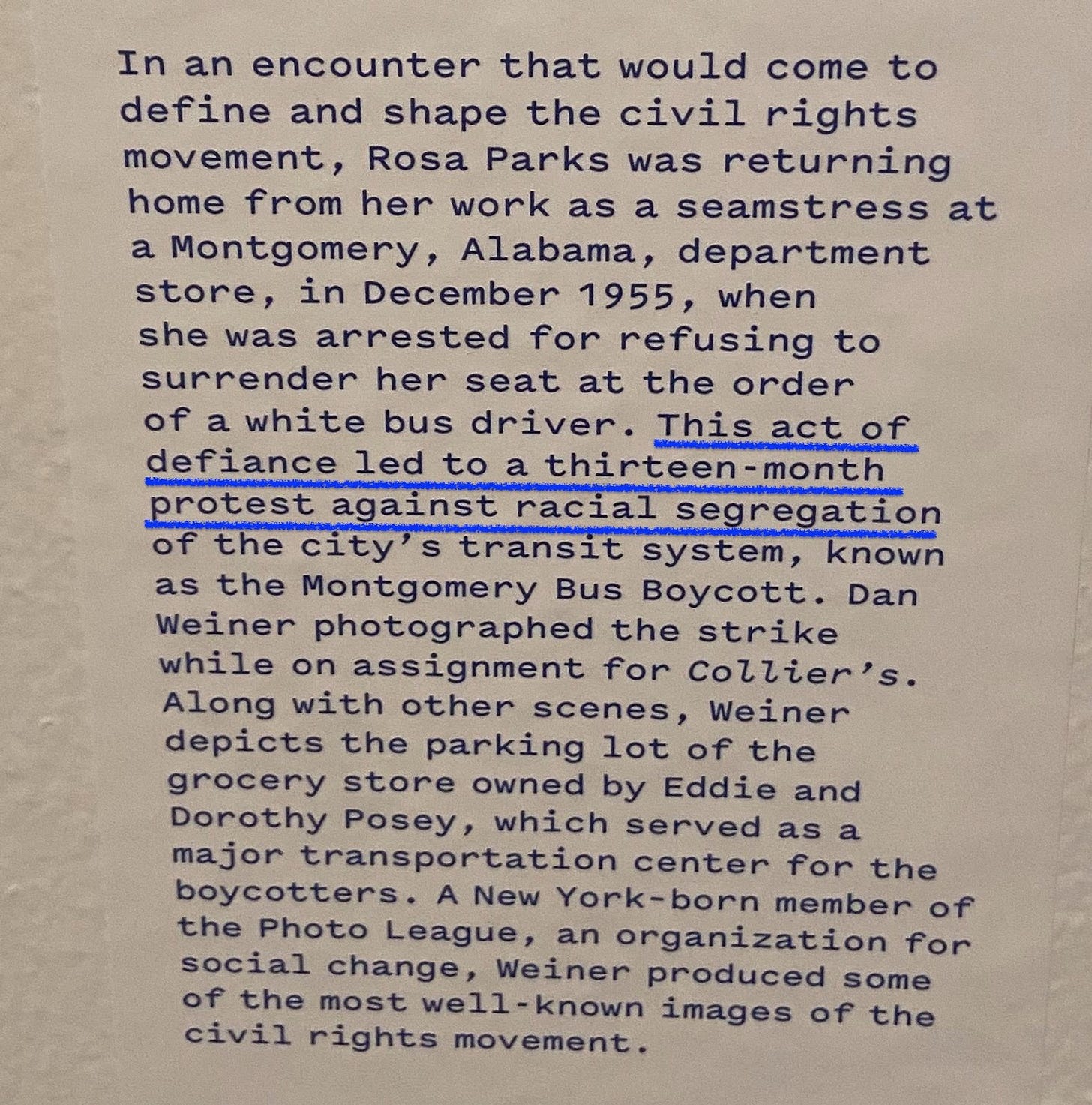 Earlier this week, I had an awkward time gap to fill on the Lower East Side, so I walked through the International Center of Photography. There’s an exhibition, American Job: 1940-2011, that captured my attention with its breadth and detail, outlining the labor movements in the US over the decades and the intersections of activism, gender, solidarity, race, and equity. The photo above of the Montgomery Bus Boycott by Dan Weiner stuck with me, partially because of the placard next to the selection of photos.