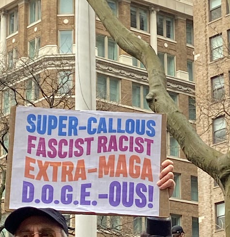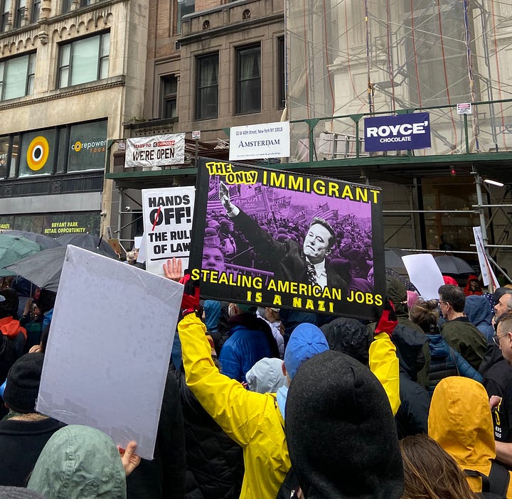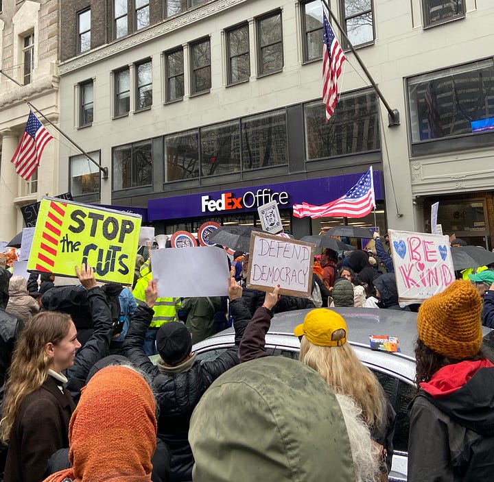 It’s hard to think of a topic that wasn’t captured by a sign, a collection of poster board to match the constant stream of executive orders and cuts passed since January.2 The cynic in me harped on the ease of a collective afternoon stroll that didn’t require many people to miss work or sacrifice much beyond art supplies, a Saturday afternoon, and the ability to stay dry. The main disruption was to anyone in a car or on a bike trying to go across town, and the blasting car horns and exasperated u-turns made it clear that unwilling sacrifices were made.